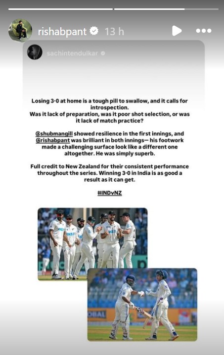 दिग्गज बल्लेबाज सचिन तेंदुलकर भी भारत की हार से निराश हैं और उन्होंने टीम पर सवाल खड़े किए हैं। लेकिन अपनी पोस्ट में सचिन ने पंत और शुभमन गिल की तारीफ की है। पंत ने अपनी स्टोरी में सचिन का पोस्ट भी लगाया है। सचिन ने लिखा है, "घर में 3-0 से हारने की बात को पचा पाना काफी मुश्किल है। इससे हमें आत्मचिंतन की जरूरत है। क्या ये तैयारियों की कमी के कारण हुआ? क्या ये गलत शॉट सेलेक्शन के कारण हुआ? क्या ये मैच प्रैक्टिस की कमी के कारण हुआ?"