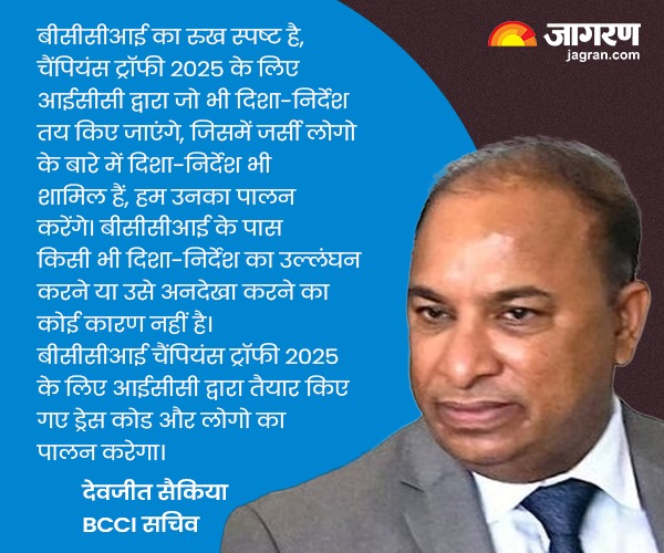 बीसीसीआई सचिव देवजीत सैकिया ने कहा, बीसीसीआई का रुख स्पष्ट है, चैंपियंस ट्रॉफी 2025 के लिए आईसीसी द्वारा जो भी दिशा-निर्देश तय किए जाएंगे, जिसमें जर्सी लोगो के बारे में दिशा-निर्देश भी शामिल हैं, हम उनका पालन करेंगे। ऐसे किसी भी दिशा-निर्देश का उल्लंघन करने का कभी कोई इरादा नहीं था। इसलिए, मीडिया में जो कुछ भी चल रहा था, मैंने उसे देखा है। मुझे नहीं पता कि उन्हें यह जानकारी कहां से मिली।