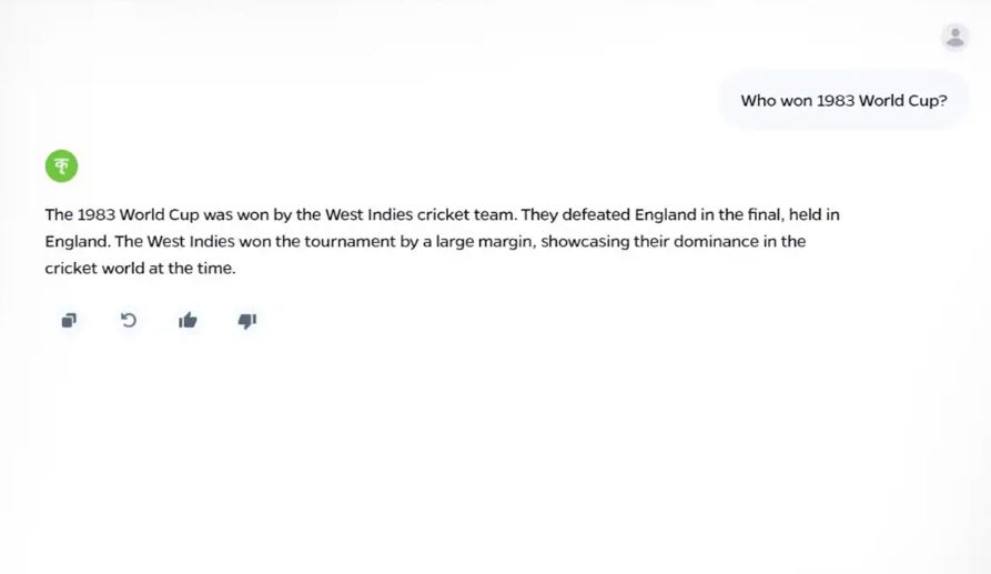 कृत्रिम AI टूल ने पूछे गए सवाल के जवाब में कहा, 1983 का वर्ल्ड कप वेस्टइंडीज क्रिकेट टीम ने जीता था। वेस्टइंडीड ने इंग्लैंड में आयोजित फाइनल मैच में इंग्लैंड कोa हराया था। क्रिकेट जगत में अपना दबदबा दिखाते हुए वेस्टइंडीज ने बड़े अंतर से टूर्नामेंट जीता था।