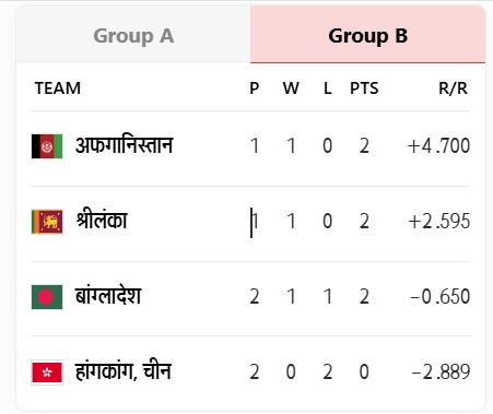 ग्रुप बी की बात करें तो यहां सुपर-4 की जंग काफी रोमांचक हो चुकी है। अफगानिस्तान, श्रीलंका और बांग्लादेश अपने 1-1 मैच जीत चुकी है। तीनों टीमों के 2-2 अंक हैं। वहीं हांगकांग दोनों मैच गंवा चुकी है। अफगानिस्तान ने हांगकांग को, श्रीलंका ने बांग्लादेश को और बांग्लादेश ने हांगकांग को हराया है। हालांकि, बांग्लादेश को श्रीलंका के हाथों शिकस्त भी मिली है।