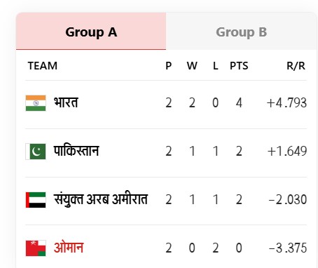 टीम इंडिया के 2 मुकाबलों में 4 अंक हैं और नेट रन रेट +4.793 है। भारतीय टीम ऑफिशियली सुपर-4 चरण के लिए क्वालिफाई कर गई है। वहीं बैक टू बैक हार के चलते ओमान टीम टूर्नामेंट से बाहर हो गई है। यूएई से पहले पाकिस्तान ने ओमान को पटखनी दी थी।