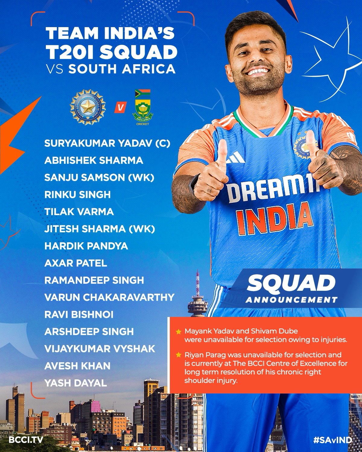 (2) रियान पराग चयन के लिए उपलब्ध नहीं थे और वर्तमान में अपने दाहिने कंधे की पुरानी चोट के समाधान के लिए बीसीसीआई सेंटर ऑफ एक्सीलेंस में हैं।