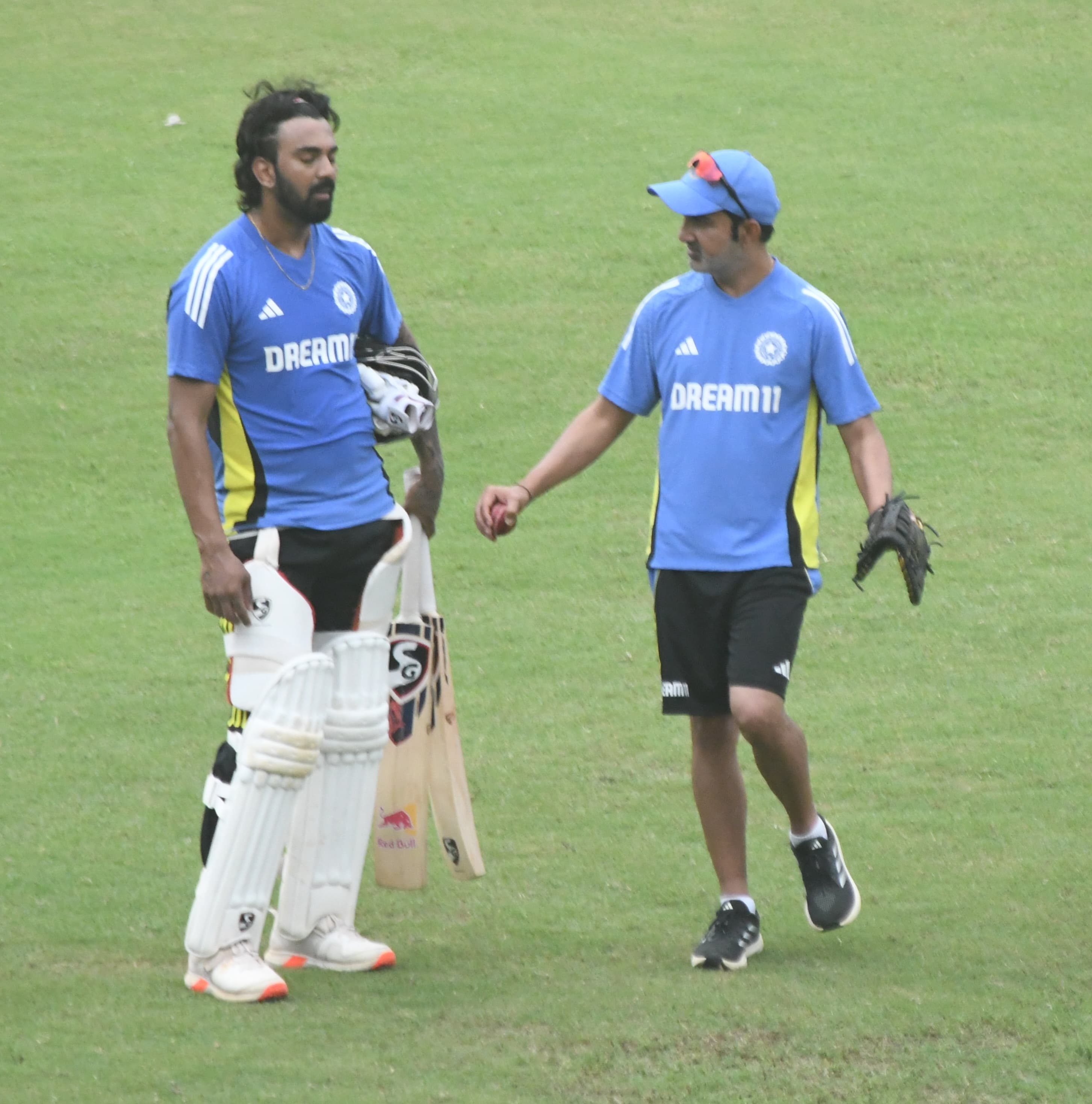 कानपुर टेस्ट से पहले भारतीय टीम के स्टार विकेटकीपर बल्लेबाज केएल राहुल को प्रैक्टिस सेशन के दौरान कोच गौतम गंभीर से बातचीत करते हुए देखा गया। गंभीर को देखकर लग रहा है कि वह राहुल को टिप्स दे रहे हैं।