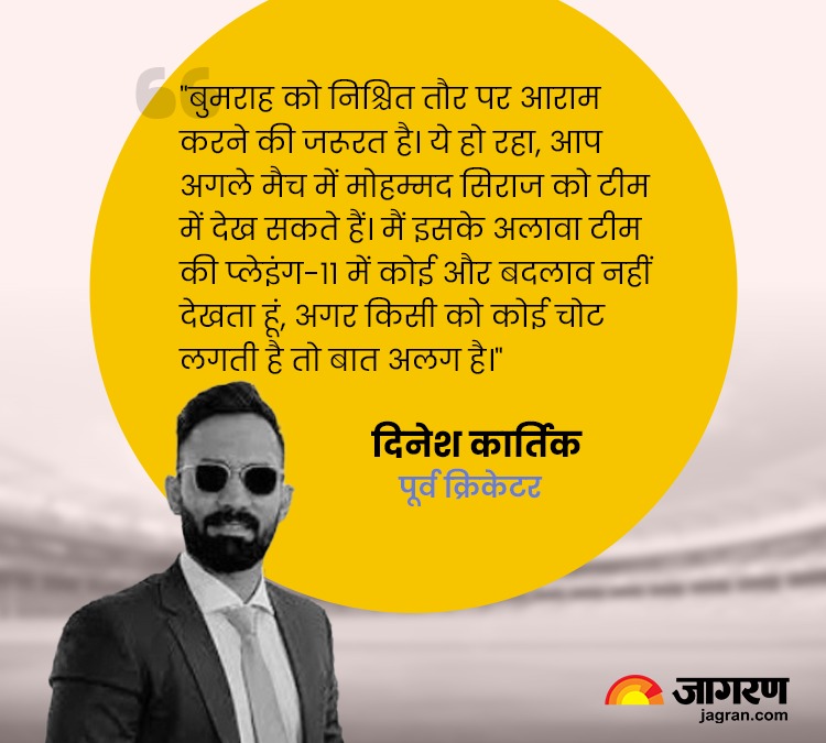 कार्तिक ने क्रिकबज से बात करते हुए कहा, "बुमराह को निश्चित तौर पर आराम करने की जरूरत है। ये हो रहा, आप अगले मैच में मोहम्मद सिराज को टीम में देख सकते हैं। मैं इसके अलावा टीम की प्लेइंग-11 में कोई और बदलाव नहीं देखता हूं, अगर किसी को कोई चोट लगती है तो बात अलग है। मैं इसका कोई कारण नहीं देखता हूं कि जो बल्लेबाज और गेंदबाज पुणे में खेले थे उन्हें एक और मौका नहीं मिलेगा।"