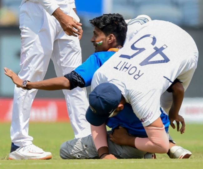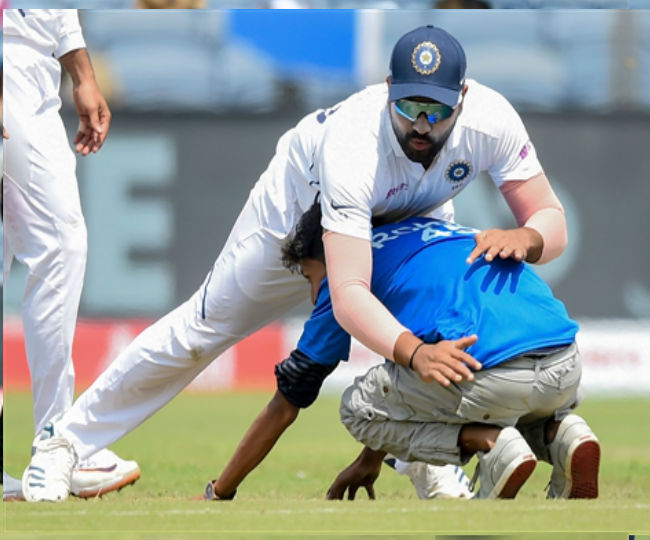 अचानक मैदान पर पहुंचे इस युवक की वजह से रोहित शर्मा को संभलने का बिल्कुल भी मौका नहीं मिला। इससे पहले रोहित संभल पाते युवक ने उनके पैर पकड़ लिए और वो मैदान पर गिर पड़े।