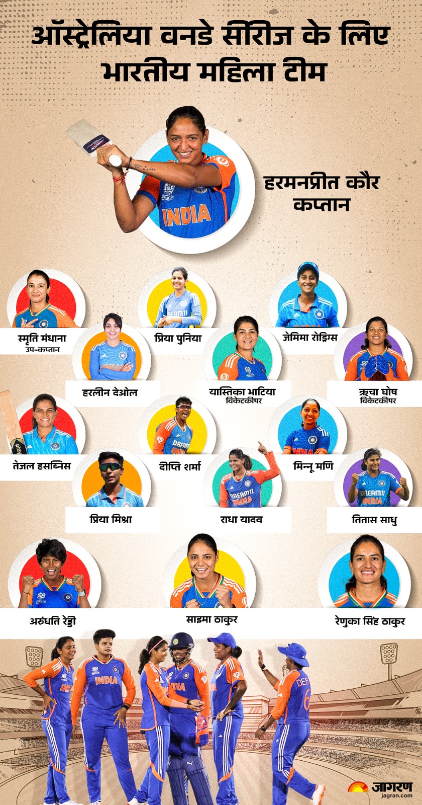 वहीं हर्लिन देओल टीम में जगह बना पाने में सफल रही हैं। वह दिसंबर 2023 के बाद पहली बार टीम में आई हैं। पिछले साल विमंस प्रीमियर लीग में गुजरात जायंट्स की तरफ से खेलते हुए हर्लिन को चोट लग गई थी जिसके कारण वह लंबे समय तक खेल से दूर रहीं। न्यूजीलैंड सीरीज में बाहर रहीं ऋचा घोष को भी टीम में जगह मिली है। चोट के कारण आशा शोभना और पूजा वस्त्राकर को टीम से बाहर ही रखा गया है।