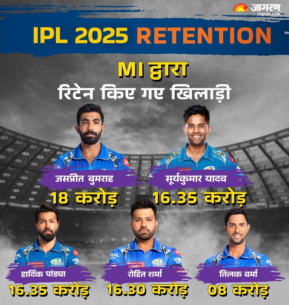 IPL 2025 के लिए मेगा ऑक्शन 24 और 25 नवंबर को साउदी अरब के जेद्दा में होगा। इससे पहले सभी फ्रेंचाइजी ने अपने रिटेन प्लेयर्स की लिस्ट जारी की। मुंबई इंडियंस ने 5 प्लेयर्स को रिटेन किया था। मुंबई इंडियंस ने कप्तान हार्दिक पांड्या रोहित शर्मा तेज गेंदबाज जसप्रीत बुमराह तूफानी बल्लेबाज सूर्यकुमार यादव और तिलक वर्मा को रिटेन किया था।