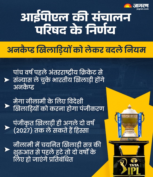 बीसीसीआइ उन खिलाडि़यों को अनकैप्ड प्लेयर की सूची में लाने जा रही है जो पांच वर्ष पहले अंतरराष्ट्रीय क्रिकेट (टेस्ट, वनडे और टी-20 अंतरराष्ट्रीय) को अलविदा कह चुके हैं। साथ ही वह बीसीसीआई के केंद्रीय अनुबंध से भी बाहर हैं। यह नियम विशेषकर महेंद्र सिंह धोनी को लेकर बनाया गया है। वह अंतरराष्ट्रीय क्रिकेट से 15 अगस्त 2019 को सन्यास ले चुके हैं। हालांकि, धोनी आईपीएल में पिछले पांच वर्ष से लगातार खेल रहे हैं।