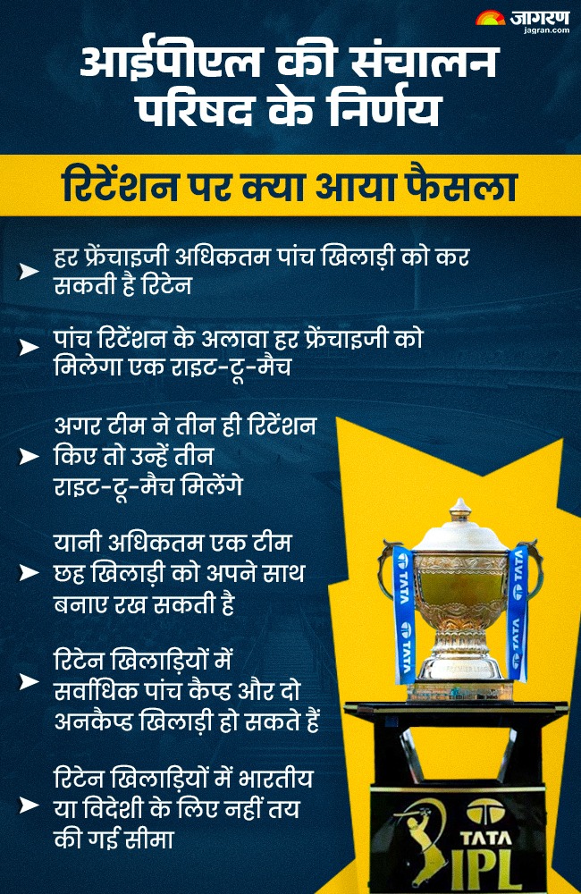 जेएनएन, नई दिल्ली: आईपीएल की संचालन परिषद ने शनिवार को निर्णय किया कि 10 फ्रेंचाइजी को अपनी पिछली टीम से अधिकतम छह खिलाड़ियों को बरकरार रखने (रिटेन) करने की अनुमति होगी जिसमें नीलामी का एक 'राइट टू मैच' (आरटीएम) कार्ड भी शामिल होगा, जिसकी कीमत 120 करोड़ रुपये के बढ़े हुए टीम पर्स में से 75 करोड़ रुपये होगी।