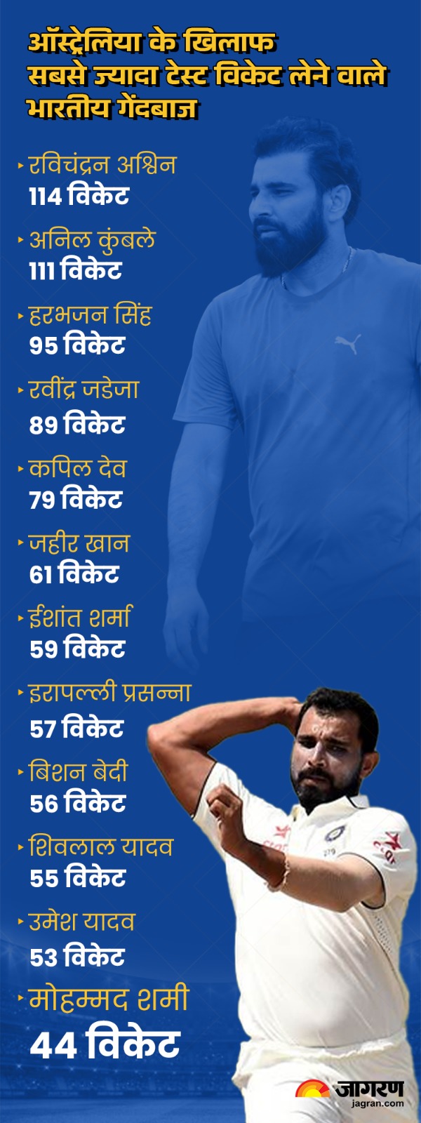 ऑस्ट्रेलिया के खिलाफ शमी ने अब तक 12 टेस्ट मैच खेले हैं। इस दौरान 32.09 की औसत से 44 विकेट चटकाए हैं। ऑस्ट्रेलिया में शमी ने अब तक 8 टेस्ट मैच खेले हैं। कंगारू जमीं पर भारतीय तेज गेंदबाज ने 31 शिकार किए हैं।