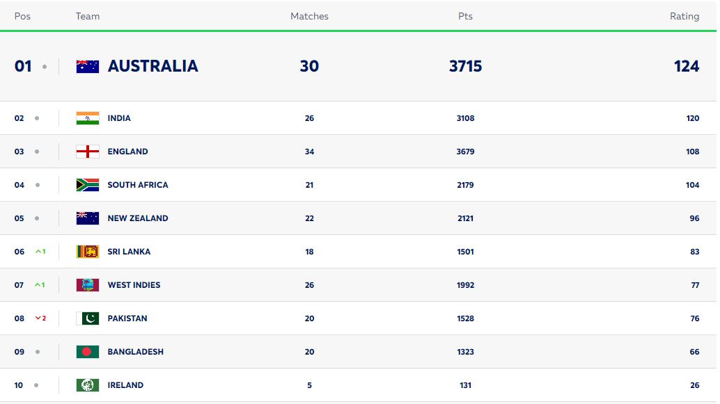 बात करें टेस्ट टीम रैंकिंग कि तो ऑस्ट्रेलिया 124 प्वाइंट्स के साथ पहले स्थान पर बना हुआ है। 120 अंक के साथ भारत दूसरे नंबर पर काबिज है। इंग्लैंड और साउथ अफ्रीका क्रमशः तीसरे और चौथे स्थान पर है। दोनों की रेटिंग 100 के ऊपर है। पाकिस्तान के खिलाफ टेस्ट सीरीज जीतने के बावजूद भी बांग्लादेश 9वें स्थान पर है। हालांकि, श्रीलंका को जबरदस्त फायदा हुआ है। वह छहठे स्थान पर पहुंच गया है।