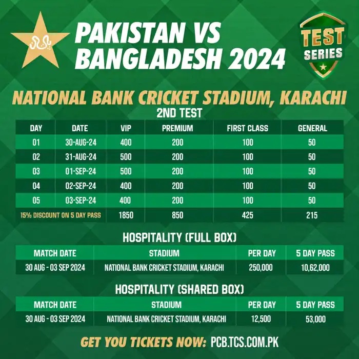 पाकिस्तान और बांग्लादेश के बीच टेस्ट सीरीज के लिए जनरल टिकट की कीमत 50 पाकिस्तानी रुपये प्रतिदिन रखी गई है। इसके अलावा फर्स्ट क्लास टिकट की कीमत प्रतिदिन 100 पाकिस्तानी रुपये, प्रीमियर टिकट की कीमत प्रतिदिन 200 पाकिस्तानी रुपये और वीआईपी टिकट की प्रतिदिन कीमत 400 पाकिस्तानी रुपये रखी गई है। पूरे 5 दिन का पास लेने पर 15 प्रतिशत डिस्काउंट भी दिया जा रहा है।