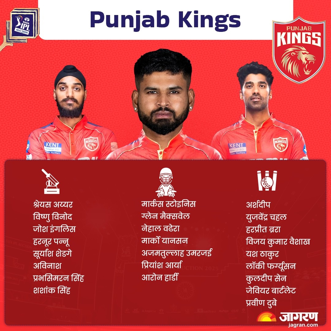 पंजाब किंग्स ने जेद्दा में संपन्न आईपीएल 2025 नीलामी के जरिये अपना 25 सदस्यीय स्क्वाड तैयार कर लिया है। फ्रेंचाइजी ने इसके लिए 119.65 करोड़ रुपये खर्च किए। पंजाब किंग्स के लिए मेगा नीलामी में सबसे महंगे खिलाड़ी श्रेयस अय्यर रहे जिन्हें 26.75 करोड़ रुपये में खरीदा गया। पंजाब ने अर्शदीप को आरटीएम के जरिये 18 करोड़ रुपये में हासिल किया। अब ऐसा है स्क्वाड।