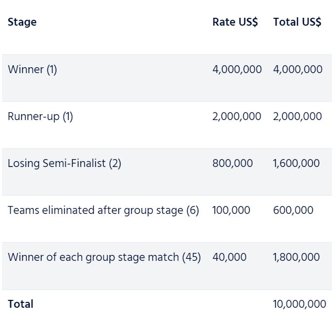 ग्रुप स्टेज के अंत में जो टीमें नॉकआउट में पहुंचने में विफल रहेंगी, उनमें से प्रत्येक को 100,000 अमेरिकी डॉलर मिलेंगे। वर्ल्ड कप जीतने वाली टीम को 4 मिलियन डॉलर की राशि दी जाएगी। वहीं, उपविजेता टीम को 2 मिलियन डॉलर की पुरस्कार राशि दी जाएगी।