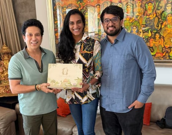 भारतीय बैडमिंटन स्टार पीवी सिंधू अपनी शादी का कार्ड देने के लिए क्रिकेट के भगवान सचिन तेंदुलकर के घर गईं थी। पीवी सिंधू के साथ उनके होने वाला पति वेंकट भी साथ नजर आया जिसकी तस्वीरें सचिन ने एक्स पर शेयर की है। इन तस्वीरों को शेयर करते हुए सचिन ने पीवी सिंधू जो कि नई पारी का आगाज करने जा रही है उन्हें बधाई दी।