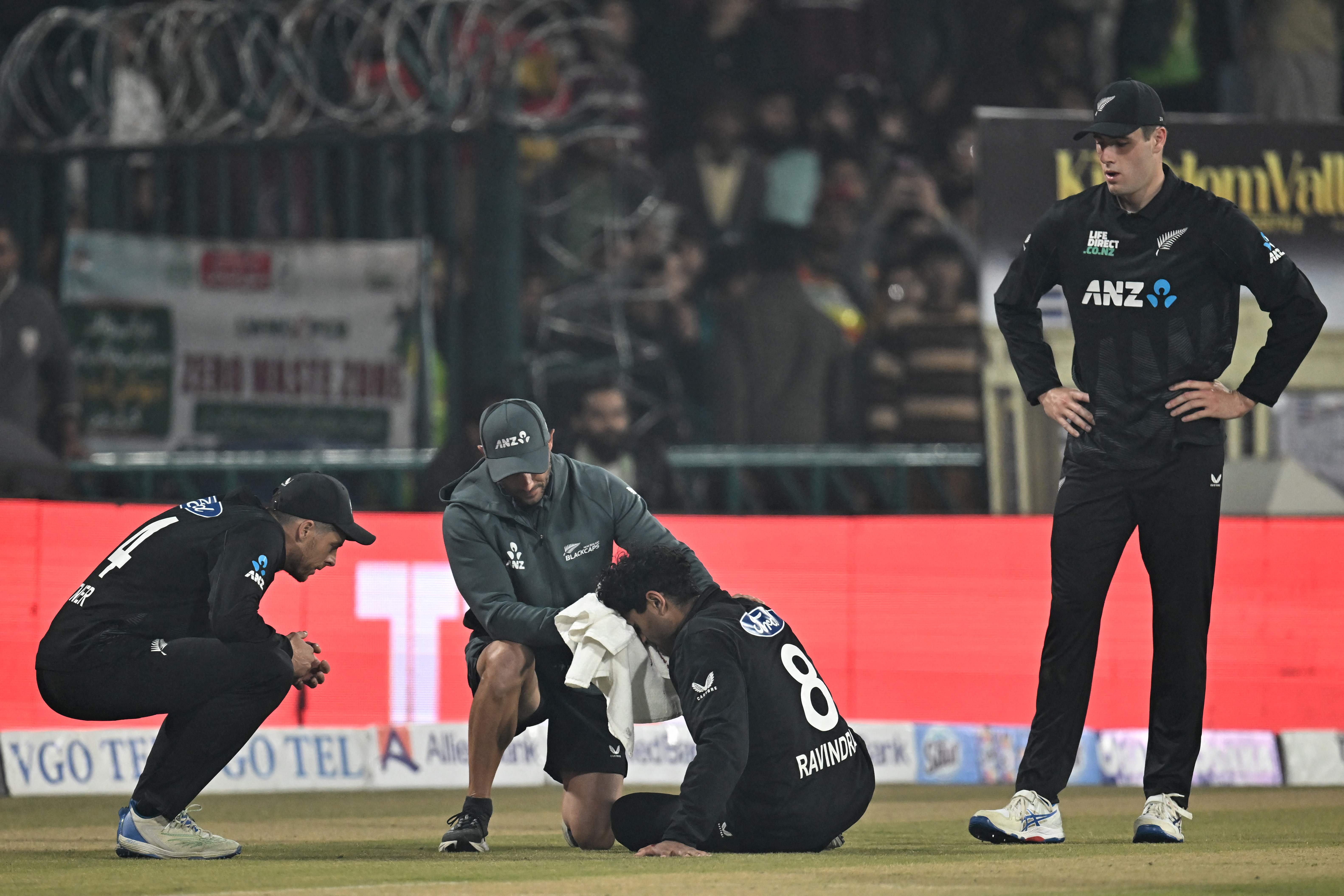 दरअसल, न्यूजीलैंड के स्टार रचिन रविंद्र (Rachin Ravindra) को पाकिस्तान की पारी के 38वें ओवर में चोट लगी। जब बल्लेबाज खुशदिल ने शॉट खेला और गेंद डीप स्क्वायर लेग की ओर गई, तब रचिन वहां मौजूद थे और उन्होंने कैच पकड़ने की कोशिश की, लेकिन गेंद सीधे उनके मुंह पर जा लगी।