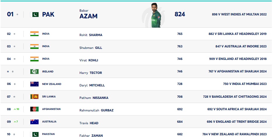 आईसीसी वनडे बल्लेबाजी रैंकिंग पर गौर करें तो पाएंगे कि पाकिस्तान के स्टार बैटर बाबर आजम शीर्ष स्थान पर काबिज हैं। इसके बाद अगले तीन स्थानों पर भारतीय खिलाड़ियों का राज है। भारतीय कप्तान रोहित शर्मा, शुभमन गिल और विराट कोहली क्रमश: दूसरे, तीसरे और चौथे स्थान पर काबिज हैं। आयरलैंड के हैरी टेक्टर टॉप-5 की लिस्ट को पूरा करते हैं।