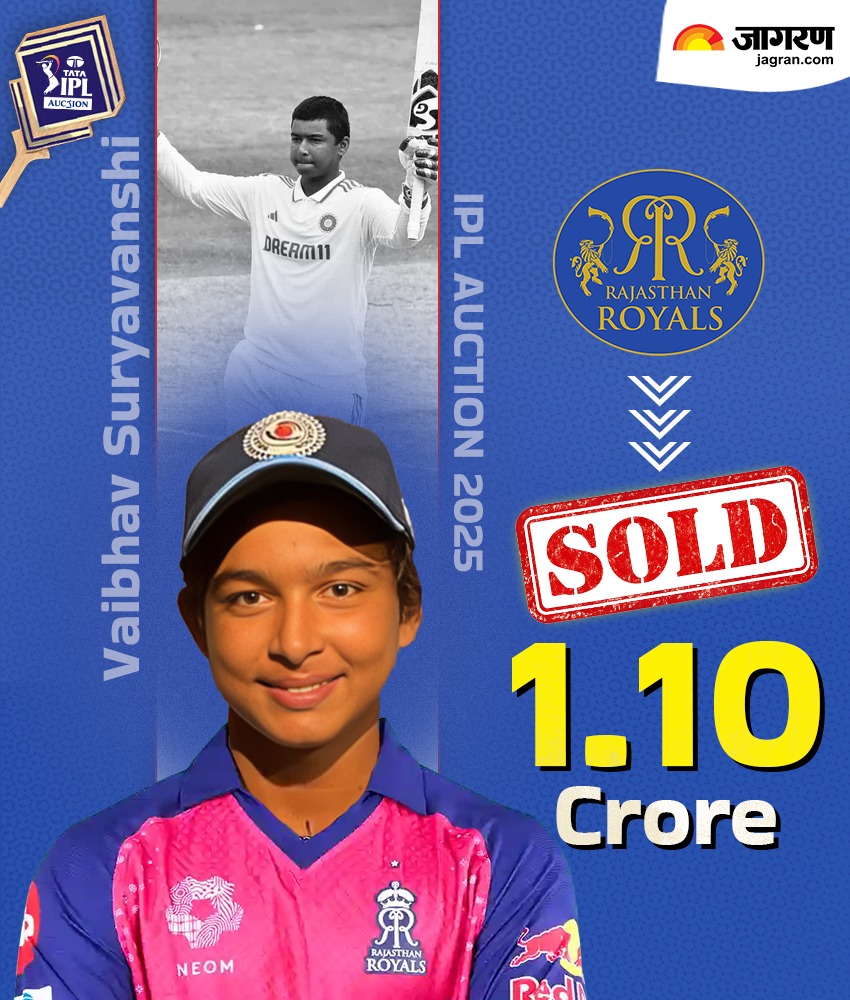 इंडियन प्रीमियर लीग 2025 से पहले साउदी अरब के जेद्दा में मेगा ऑक्शन हो रहा है। इस दौरान सभी 10 फ्रेंचाइजी ने जमकर खरीदारी की। मेगा ऑक्शन में बिहार के 13 साल के लड़के की किस्मत चमक गई। ऑक्शन में हिस्सा लेने वाले सबसे युवा प्लेयर वैभव सूर्यवंशी को राजस्थान रॉयल्स ने 1.10 करोड़ में खरीदा। उनका बेस प्राइस 30 लाख रुपये था।
