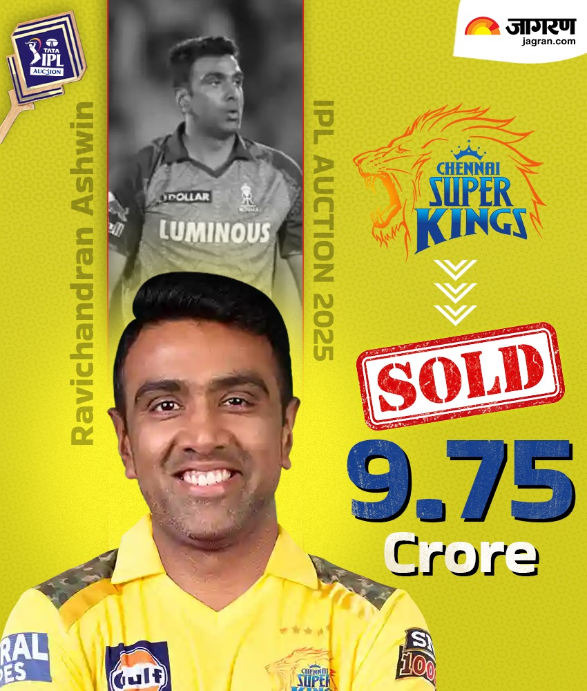 स्पोर्ट्स डेस्क, नई दिल्ली। इंडियन प्रीमियर लीग (IPL 2025) के 18वें सीजन से पहले साउदी अरब के जेद्दा में मेगा ऑक्शन हो रहा है। आज ऑक्शन का पहला दिन है। पिछले सीजन तक राजस्थान रॉयल्स का हिस्सा रहे अनुभवी स्पिनर रविचंद्रन अश्विन नीलामी में जमकर मालामाल हुए हैं। चेन्नई सुपर किंग्स ने उन्हें 9.75 करोड़ रुपये में अपने साथ जोड़ा है। अश्विन पर अन्य फ्रेंचाइजी ने भी बोली लगाई, लेकिन अंत में बाजी चेन्नई ने मारी।