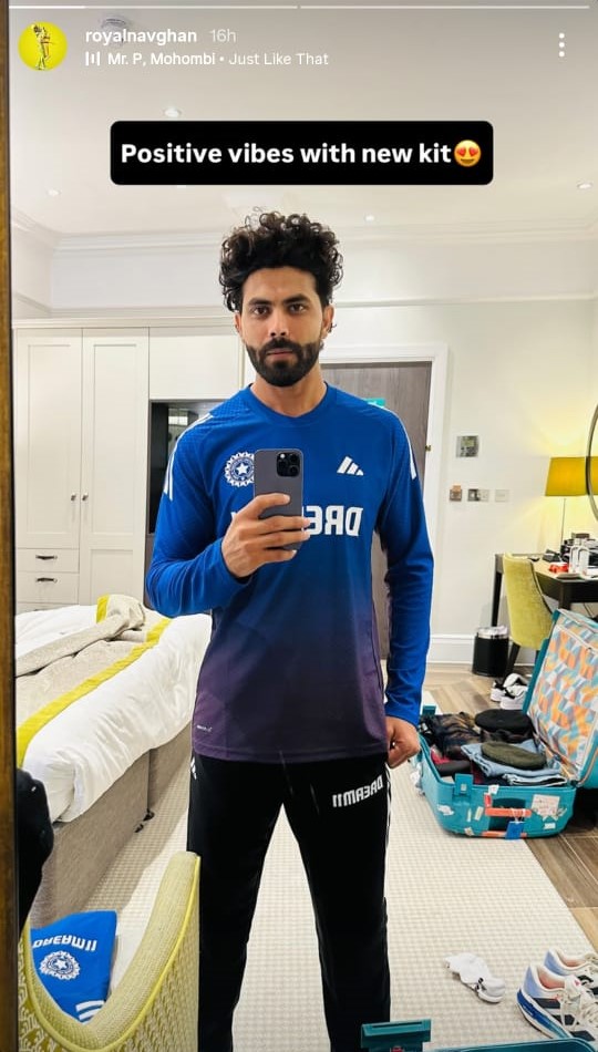 टीम इंडिया 5 जून को इंग्लैंड के लिए रवाना होने के बाद 6 को वहां पहुंच गई। वहीं अनुभवी ऑलराउंडर रवींद्र जडेजा ने 7 जून को सोशल मीडिया प्लेटफॉर्म पर एक स्टोरी पोस्ट की जिसमें वह नई ट्रेनिंग किट में नजर आए। इसमें उन्होंने कैप्शन में लिखा पॉजिटिव वाईब विद न्यू ट्रेनिंग किट।