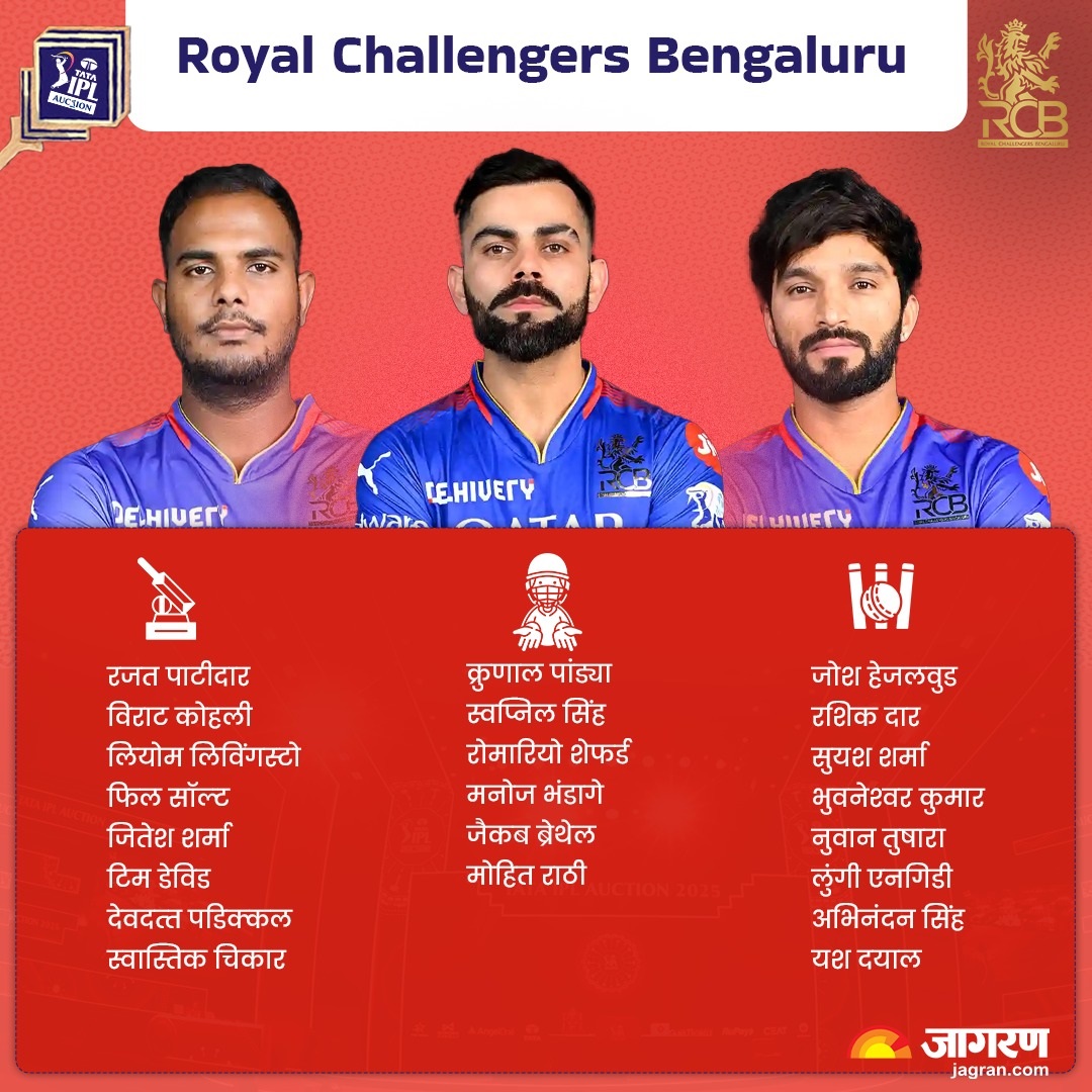 RCB Team for IPL 2025: बेंगलुरु ने 119.25 करोड़ खर्च करके 22 खिलाड़ियों का बनाया स्क्वाड, जानें किसको कितने रुपये में खरीदा
