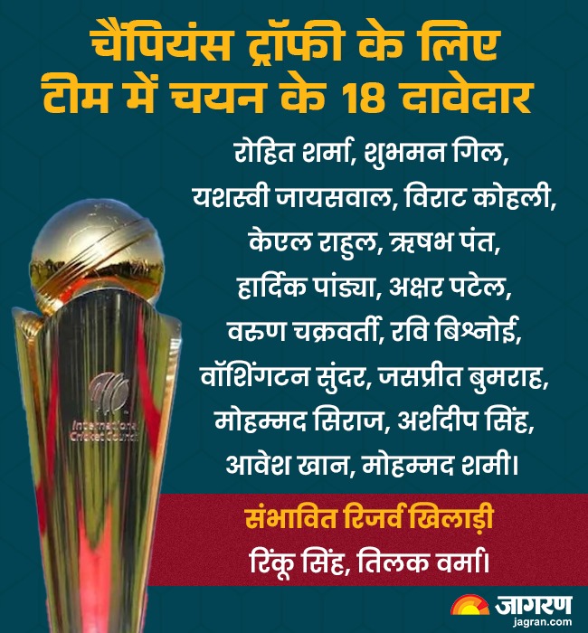 बीसीसीआई मेंस सेलेक्शन कमेटी के लिए चैंपियंस ट्रॉफी के लिए टीम चुनना बेहद पेचीदा होने वाला। इतने सारे खिलाड़ियों में से बेहतर को चुनने में चयनकर्ताओं का सिर दर्द होने वाला है। ऐसी खबरे हैं कि रोहित शर्मा और विराट कोहली टीम का हिस्सा होंगे। जबकि केएल राहुल और रविंद्र जडेजा को लेकर मंथन होगा। वहीं युवा बल्लेबाज यशस्वी को बैकअप ओपनर रखा जा सकता है।