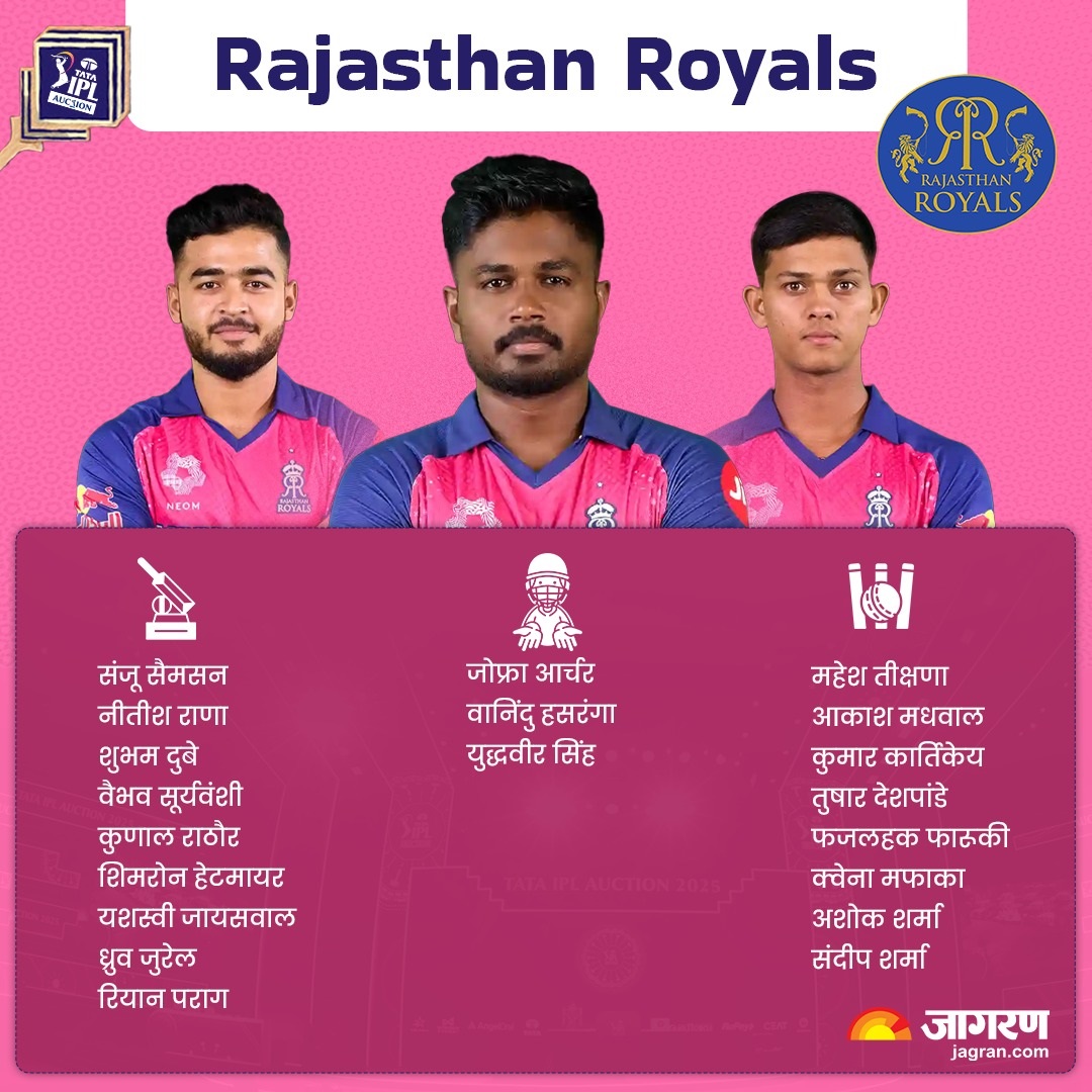 राजस्थान ने इस साल छह खिलाड़ियों को रिटेन किया है। संजू सैमसन, यशस्वी जायसवाल, रियान पराग, ध्रुव जुरेल, शिमरन हेटमायर, संदीप शर्मा को रिटेन किया है। सैमसन और जायसवाल के लिए राजस्थान ने 18 करोड़ खर्च किए हैं।