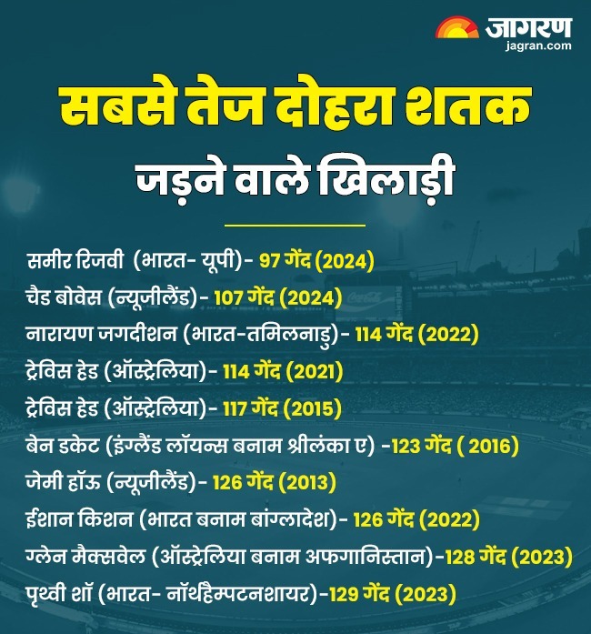 स्पोर्ट्स डेस्क, नई दिल्ली। 21 साल के समीर रिजवी ने घरेलू क्रिकेट में सबसे तेज दोहरा शतक लगाकर इतिहास रच दिया है। त्रिपुरा के खिलाफ मेंस की अंडर-23 स्टेट ए ट्रॉफी मैच में उत्तर प्रदेश की कप्तानी करते हुए रिजवी ने सिर्फ 97 गेंद पर नाबाद 201 रन बनाए। उनकी धमाकेदार पारी में 13 चौके और 20 गगनचुंबी छक्के शामिल थे, जिससे त्रिपुरा के गेंदबाजों की धज्जियां उड़ गईं।