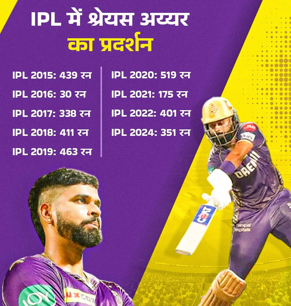 IPL 2024 में कोलकाता नाइटराइडर्स ने श्रेयस अय्यर की कप्तानी में खिताब जीता था। KKR ने फाइनल में सनराइजर्स हैदराबाद को 8 विकेट से रौंदा था। इसके साथ ही वह फाइनल में 2 फ्रेंचाइजी की कमान संभालने वाले पहले कप्तान बने। पिछले सीजन श्रेयस ने 14 मैच खेले थे। इस दौरान उन्होंने 351 रन बनाए थे। 17वें सीजन में अय्यर की औसत 39 की और स्ट्राइक रेट 146.86 की रही थी। IPL 2024 में अय्यर के बल्ले से 2 फिफ्टी भी निकली थीं। उनका बेस्ट स्कोर नाबाद 58 रन था।