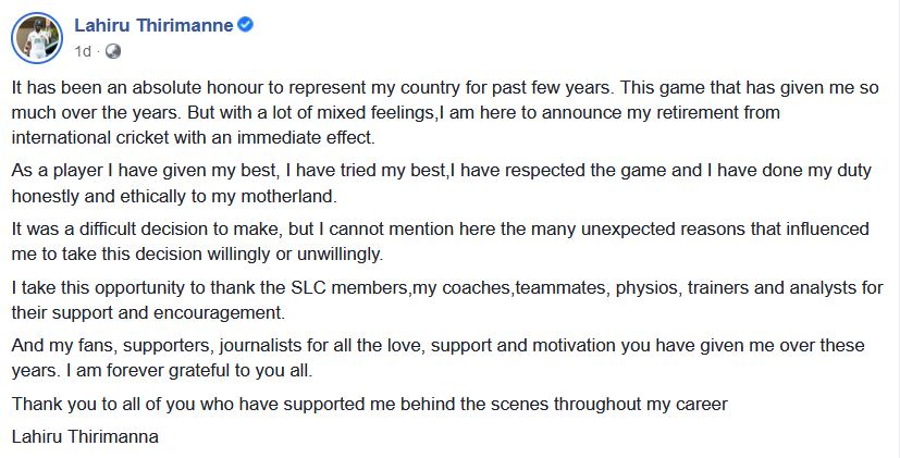 लाहिरू थिरिमाने ने इंस्टाग्राम पर लिखा, "देश के लिए खेलना मेरे लिए गर्व की बात रही है। पिछले 13 सालों में मिली खूबसूरत यादों के लिए शुक्रिया। मेरी इस यात्रा के दौरान शुभकामनाएं के लिए धन्यवाद। अब अगले पड़ाव पर मुलाकात होगी।"