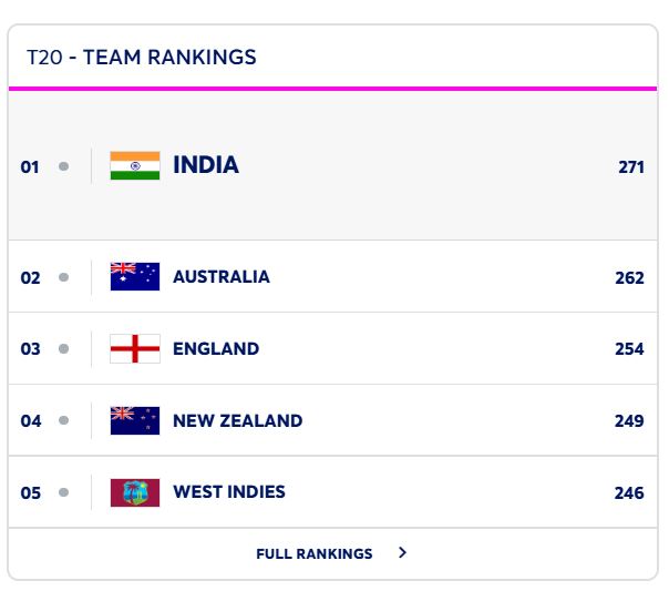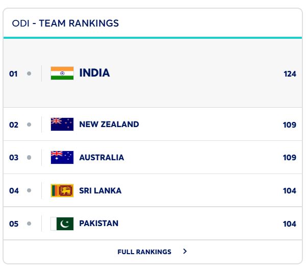 ताजा अपडेट के बाद ऑस्ट्रेलिया ने अपना शीर्ष स्थान बरकरार रखा है, लेकिन उनकी बढ़त 15 से घटकर 13 अंक रह गई है। उनके पास 126 रेटिंग अंक हैं और वे रैंकिंग में अन्य टीमों से काफी आगे हैं।