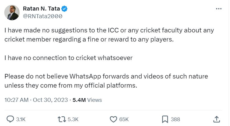 रतन टाटा ने लिखा था, मैंने ICC या किसी क्रिकेट फैकल्टी को किसी भी क्रिकेट सदस्य के बारे में किसी भी खिलाड़ी पर जुर्माना या इनाम लगाने के बारे में कोई सुझाव नहीं दिया है। मेरा क्रिकेट से कोई लेना-देना नहीं है। कृपया इस तरह के व्हाट्सएप फॉरवर्ड और वीडियो पर तब तक विश्वास न करें जब तक कि वे मेरे आधिकारिक प्लेटफॉर्म से न आए हों।