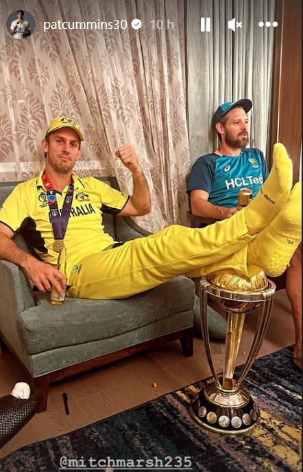 दरअसल, ऑस्ट्रेलियाई टीम के कप्तान पैट कमिंस (Pat Cummins) ने विश्व कप 2023 का खिताब जीतने के बाद अपने इंस्टाग्राम अकाउंट पर एक स्टोरी शेयर की, जिसमें मिचेल मार्श होटल के रूम में ट्रॉफी पर पैर रखे हुए नजर आ रहे हैं।
