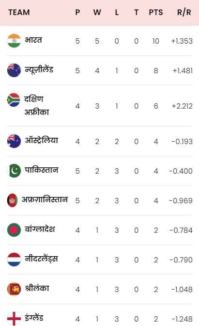 वर्ल्ड कप 2023 की प्वाइंट्स टेबल की टॉप पोजिशन पर भारत का कब्जा है। रोहित शर्मा की कप्तानी में भारत ने अब तक खेले अपनी सभी पांच मैचों में जीत का स्वाद चखा है। वहीं, दूसरे पायदान पर न्यूजीलैंड काबिज है। कीवी टीम ने पांच में से चार मैचों में जीत दर्ज की है। 4 मैचों में तीन दर्ज करने वाली साउथ अफ्रीका की टीम तीसरे पायदान पर मौजूद है।