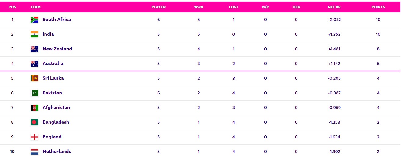 साउथ अफ्रीका टीम के पास 10 अंक है और उसका नेट रनरेट +2.032 का है। जबकि पाकिस्तान की हार के बाद भारतीय टीम दूसरे स्थान पर खिसक गई है। भारत के पास भी 10 अंक है, लेकिन उनका नेट रनरेट +1.353 का है। हार के बाद पाकिस्तान की टीम छठे स्थान पर ही 4 अंक के साथ मौजूद है।