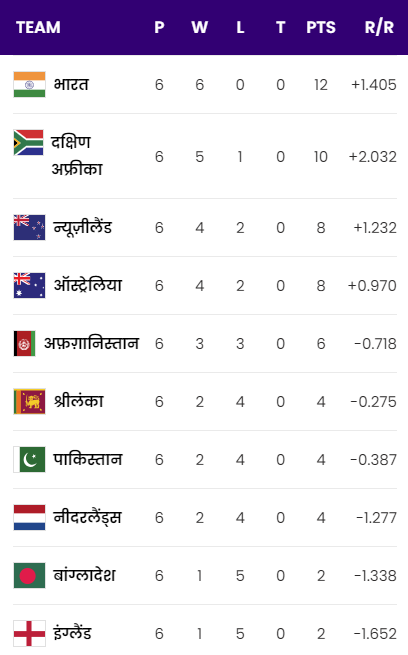 वर्ल्ड कप 2023 की प्वाइंट्स टेबल में टीम इंडिया नंबर एक पर बनी हुई है। भारतीय टीम ने अभी तक खेले अपने सभी छह मैचों में जीत दर्ज की है। साउथ अफ्रीका 6 मैचों में पांच जीत के साथ दूसरे नंबर पर काबिज है। न्यूजीलैंड 4 जीत के साथ तीसरे और ऑस्ट्रेलिया भी चार मैचों में मैदान मारने के बाद चौथी पोजिशन पर मौजूद है।