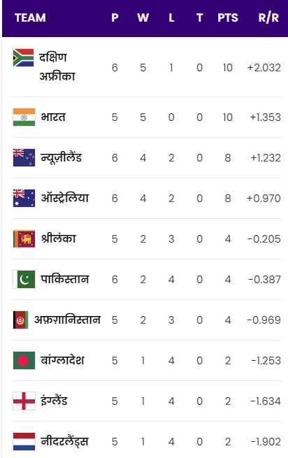 डिफेंडिंग चैंपियन इंग्लैंड प्वाइंट्स टेबल में 9वें स्थान पर मौजूद है। सबसे निचले पायदान पर नीदरलैंड्स की टीम मौजूद है। वहीं, इंग्लैंड को हराने के बाद श्रीलंका टेबल में पांचवें नंबर पर काबिज है, जबकि छठे नंबर पर पाकिस्तान मौजूद है। अफगानिस्तान सातवें और बांग्लादेश आठवें नंबर पर है।