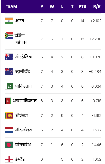पाकिस्तान की टीम भी सेमीफाइनल की रेस में अभी बनी हुई है और 7 मैचों में 3 जीत के साथ टेबल में पांचवें नंबर पर मौजूद है। अफगानिस्तान 6 मैचों में 3 जीत के साथ छठे स्थान पर है। भारत के खिलाफ मिली करारी हार के साथ श्रीलंका के लिए लगभग सेमीफाइनल के दरवाजे बंद हो चुके हैं। डिफेंडिंग चैंपियन इंग्लैंड टेबल में सबसे निचले पायदान पर काबिज है।