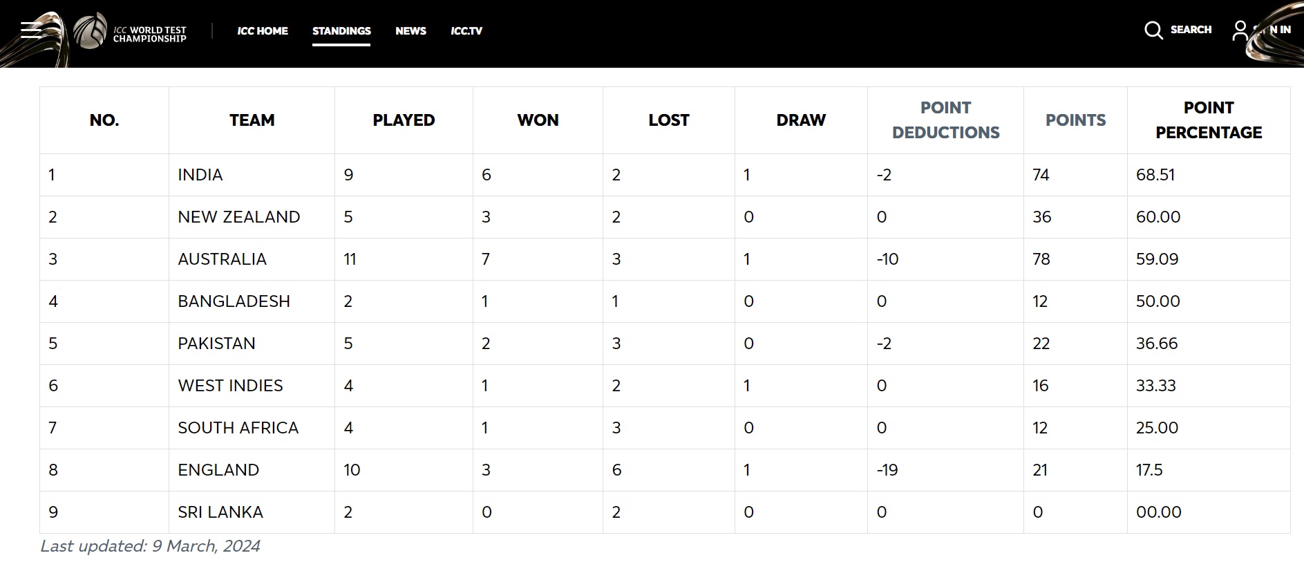 वहीं, ऑस्ट्रेलियाई टीम 11 मैचों में 7 जीत, तीन हार और एक ड्रॉ के साथ तीसरे स्थान पर है। कंगारू टीम के 76 अंक है और उसके 59.09 प्रतिशत हैं। न्यूजीलैंड-ऑस्ट्रेलिया के बीच क्राइस्टचर्च में दूसरा टेस्ट जारी है। जो भी टीम इसमें विजेता बनेगी, उसका दूसरे नंबर पर पहुंचना तय है। यह रेस रोमांचक नजर आ रही है।