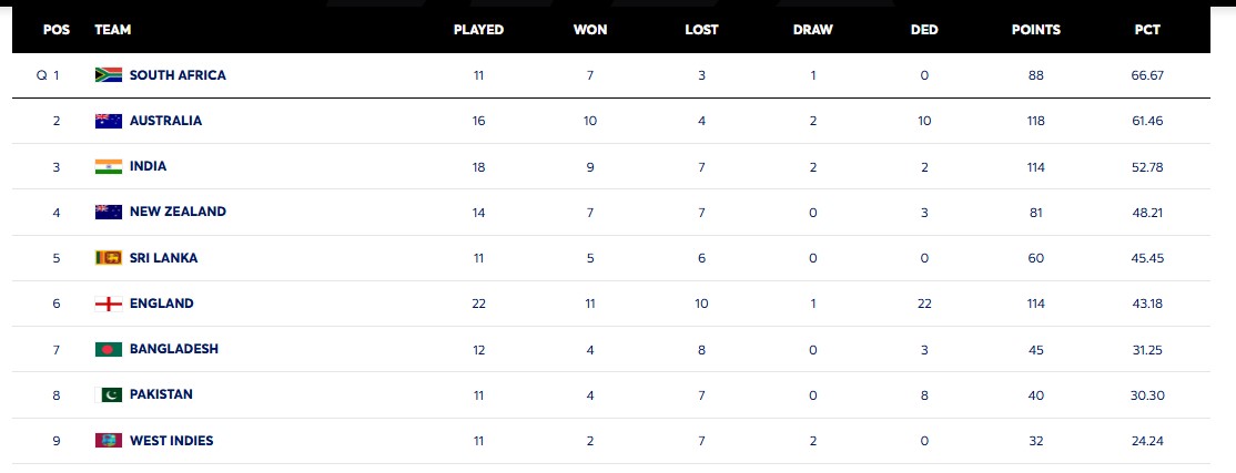 इससे पहले साउथ अफ्रीका की टीम ने पाकिस्तान को सेंचुरियन टेस्ट में हराकर डब्ल्यूटीसी फाइनल में अपनी जगह बनाई। साउथ अफ्रीका ने पहली बार WTC Final में प्रवेश किया। अब एक स्पॉट के लिए तीन टीमों के बीच टक्कर है, जिसमें भारत, ऑस्ट्रेलिया और श्रीलंका शामिल है। न्यूजीलैंड, इंग्लैंड, पाकिस्तान, बांग्लादेश और वेस्टइंडीज की टीमें फाइनल की रेस से पहले ही आउट हो चुके हैं। बता दें कि WTC के मौजूदा चक्र का फाइनल अगले साल 11-15 जून तक क्रिकेट के मक्का लॉर्ड्स में खेला जाना है।