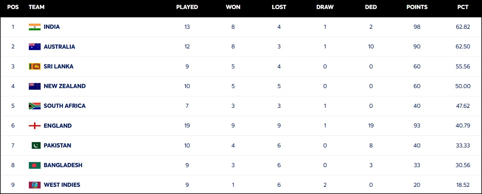 वर्ल्ड टेस्ट चैंपियनशिप पॉइंट टेबल
