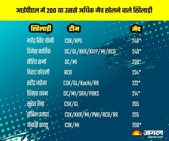 बता दें कि आईपीएल में 200 या उससे ज्यादा खेलने वाले खिलाड़ियों में भारत के पूर्व कप्तान महेंद्र सिंह धोनी का भी नाम शामिल है। वहीं, पूर्व हरफनमौला खिलाड़ी सुरेश रैना भी 200 आईपीएल मैच खेल चुके हैं। आरसीबी के स्टार विराट कोहली और मुंबई इंडियंस के कप्तान रोहित शर्मा भी आईपीएल में 200 मैच खेल चुके हैं। पूर्व कोलकाता के कप्तान और आरसीबी के विकेटकीपर बल्लेबाज दिनेश कार्तिक भी इस लिस्ट में शामिल हैं।
