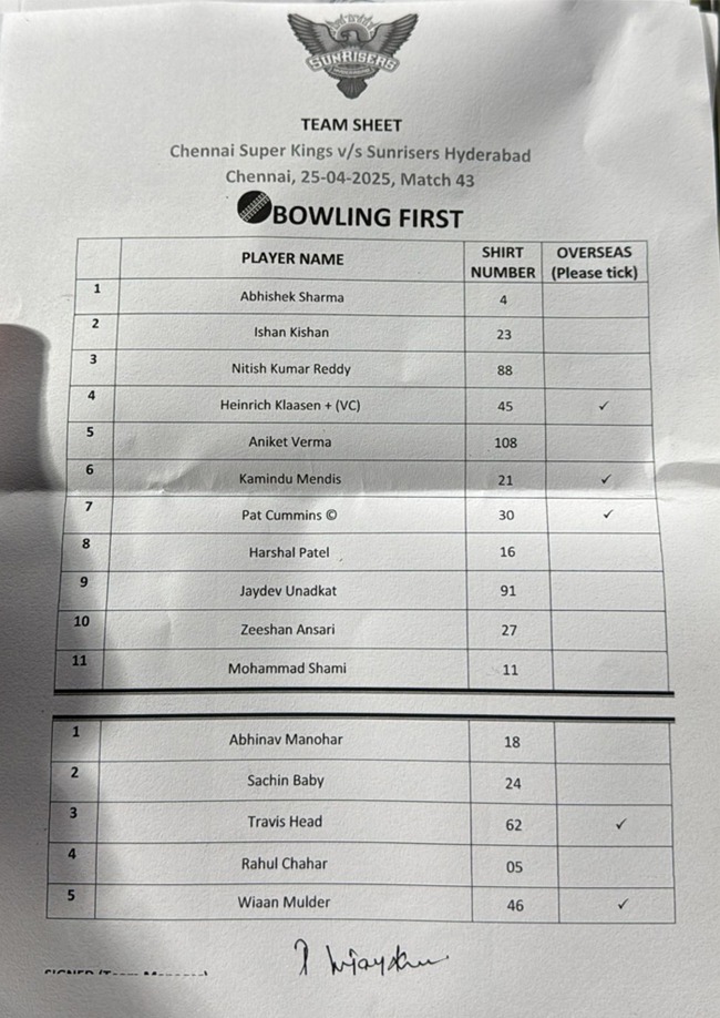 सनराइजर्स हैदराबाद की प्लेइंग इलेवन: अभिषेक शर्मा, ईशान किशन, नीतीश कुमार रेड्डी, हेनरिक क्लासेन (विकेटकीपर), अनिकेत वर्मा, कामिंडू मेंडिस, पैट कमिंस (कप्तान), हर्षल पटेल, जयदेव उनादकट, जीशान अंसारी, मोहम्मद शमी।