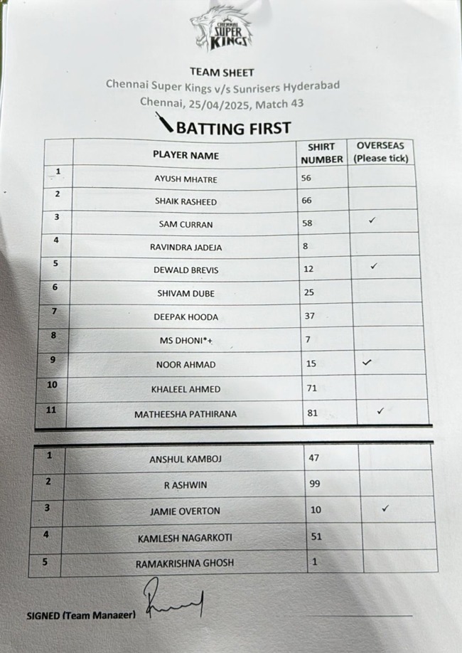 चेन्नई सुपर किंग्स की प्लेइंग इलेवन: एमएस धोनी (कप्तान), शेख रशीद, आयुष महात्रे, सैम करन, रवींद्र जड़ेजा, डेवाल्ड ब्रेविस, शिवम दुबे, दीपक हुडा, नूर अहमद, खलील अहमद, मथीशा पथिराना।