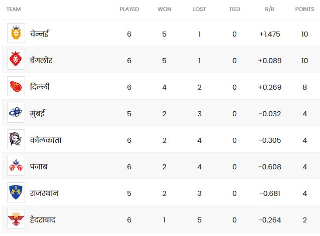 इस वक्त अंक तालिका पर नजर डाले तो चेन्नई सुपर किंग्स की टीम सबसे उपर नजर आएगी। 6 मैच खेलने के बाद 5 मैच जीतकर टीम ने 10 अंक हासिल किए हैं और लगातार पांच मैच जीतने वाली इस सीजन में वह पहली टीम भी बनी है। आरसीबी ने भी 6 मैच खेलने के बाद 5 में जीत दर्ज कर 10 अंक हासिल किए हैं लेकिन वह नेट रन रेट में चेन्नई से पीछे है। तभी एक दिन पहले ही नंबर एक पहुचंने के बाद दूसरे दिन ही उनको दूसरे स्थान पर पहुंचना पड़ा।