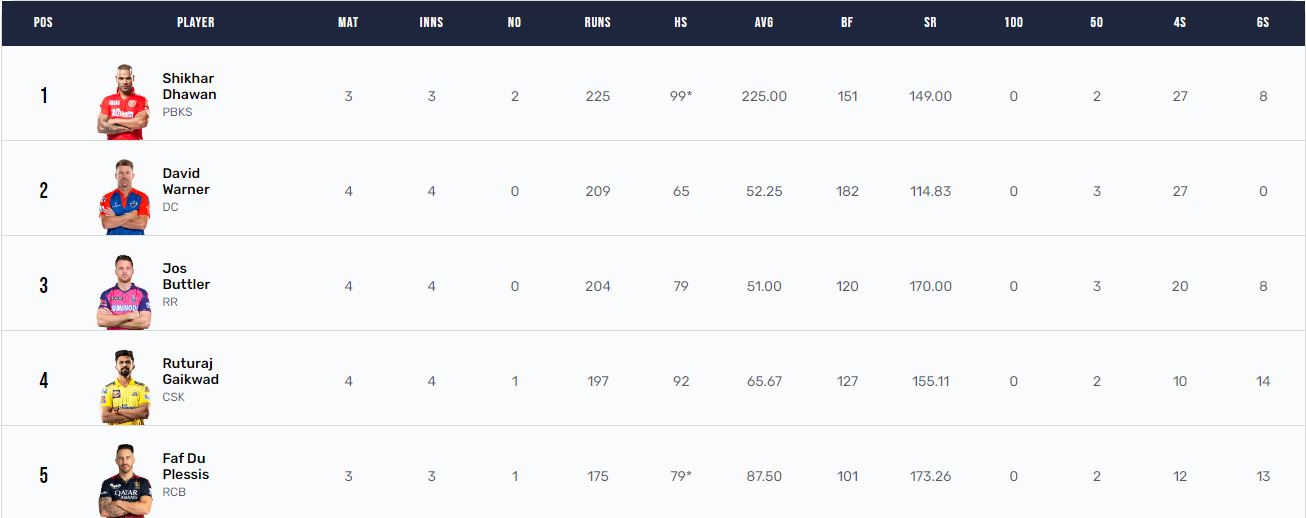 ऑरेंज कैप रेस में टॉप पर शिखर धवन (225 रन) है, जबकि दूसरे नंबर पर डेविड वॉर्नर (209 रन) पहुंच गए है। तीसरे नंबर पर बटलर (204 रन), चौथे नंबर पर ऋतुराज गायकवाड़ (197 रन) पांचवें नंबर फाफ डु प्लेसिस (175 रन) मौजूद हैं।