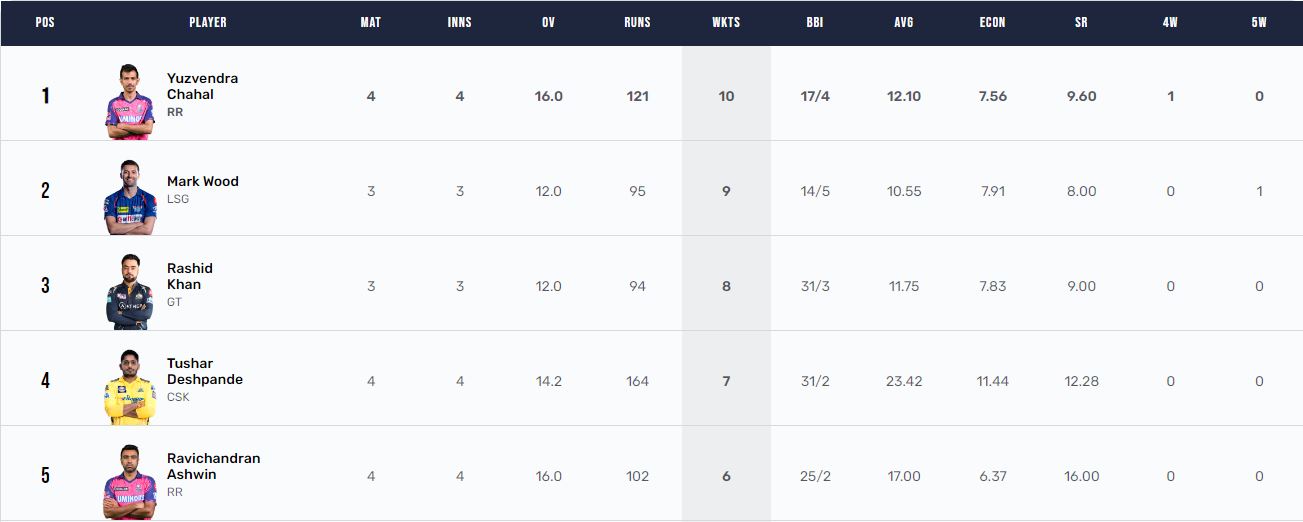राजस्थान के लिए एक विकेट लेने वाले युजवेंद्र चहल को पर्पल कैप मिल गई है। आईपीएल 2023 की पर्पल कैप रेस में वह लखनऊ सुपर जायंट्स के तेज गेंदबाज मार्क वुड टॉप से एक पीछे थे। वुड के नाम अब तक कुल 3 मैचों में 9 विकेट दर्ज हैं। वहीं, युजवेंद्र चहल के नाम 4 मैच में 10 विकेट दर्ज हो गए हैं। मार्क वुड अब दूसरे स्थान पर पहुंच गए। तीसरे नंबर पर राशिद खान है, जिन्होंने 8 विकेट चटकाए हैं। चेन्नई के तुषार देशपांडे 7 विकेट के साथ चौथे स्थान पर पहुंच गए हैं। पांचवें नंबर पर रविचंद्रन अश्विन हैं, उनके नाम 6 विकेट दर्ज हैं। चेन्नई के खिलाफ उन्होंने दो विकेट लिए।