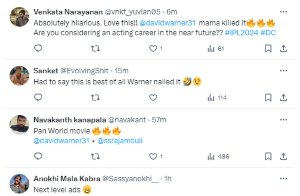 वीडियो में, राजामौली को वॉर्नर से आईपीएल 2024 मैच के लिए टिकट मांगते हुए देखा जा सकता है। इसके बाद वॉर्नर ने राजामौली के लिए एक शर्त रखी, जहां उन्हें रियायती टिकट के बदले में अपनी फिल्म में बल्लेबाज को शामिल करना होगा। इसके बाद राजामौली कल्पना करते हैं कि उनकी फिल्म कैसे बनेगी। अंततः वह वॉर्नर के साथ फिल्म बनाने से मना कर देते हैं।