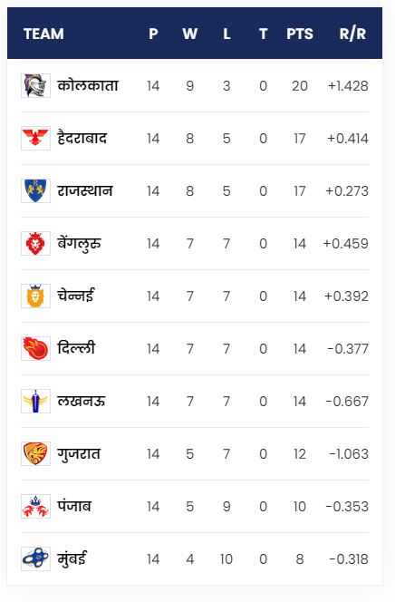 आईपीएल 2024 के 70 लीग मैच खत्म हो चुके हैं और चार टीमें प्लेऑफ में पहुंच चुकी हैं। कोलकाता नाइट राइडर्ड सनराइजर्स हैदराबाद राजस्थान रॉयल्स और रॉयल चैलेंजर्स बेंगलुरु ने प्लेऑफ के लिए क्वालीफाई किया है। पहले क्वालीफायर मुकाबले में केकेआर का सामना एसआरएच से होगा। वहीं आरआर का सामना आरसीबी से होगा। मुंबई इंडियंस प्वाइंट्स टेबल में 10वें स्थान पर रही।