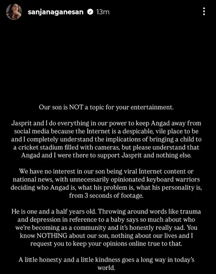 संजना और जसप्रीत दोनों ने अपने इंस्टाग्राम पर एक ही फोटो शेयर की है। संजना की पोस्ट में लिखा है, "हमारा बेटा आपके एंटरटेनमेंट का विषय नहीं है। जसप्रीत और मैं पूरी कोशिश करते हैं कि अंगद को सोशल मीडिया से दूर रखा जाए क्योंकि इंटरनेट नफरत वाली जगह है। मैं पूरी तरह से समझती हूं कि एक बच्चे को कैमरों से भरे स्टेडियम में लाने से क्या हो सकता है, लेकिन कृप्या इस बात को समझिए के मैं और अंगद जसप्रीत को सपोर्ट करने के लिए वहां गए थे।"
